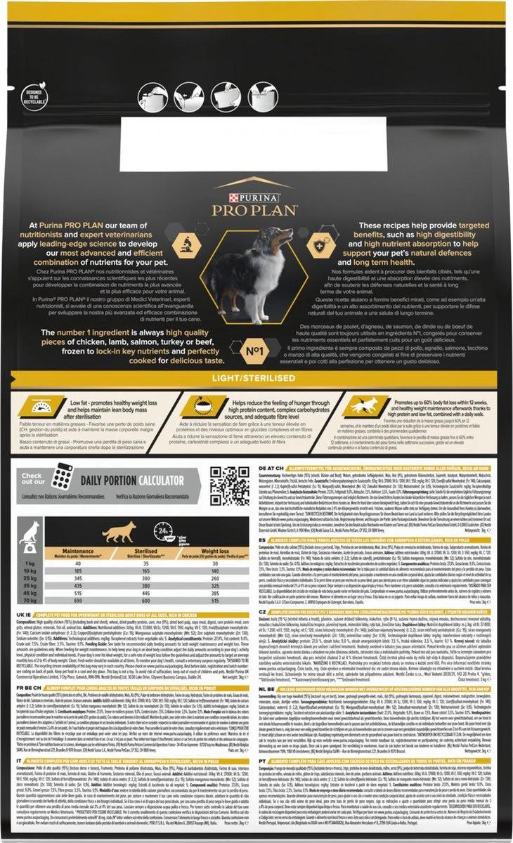 PURINA PRO PLAN Light/Sterilised hondenvoer rijk aan kip, speciaal voor honden na sterilisatie, bevat een combinatie aan voedingstoffen die laag is in vet, een gezond gewichtsverlies bevordert en de vetvrije lichaamsmassa helpt behouden na sterilisatie. Het nummer 1 ingrediënt is altijd stukken kip, lam, zalm, kalkoen of rundvlees van hoge kwaliteit, ingevroren om belangrijke voedingsstoffen vast te houden en perfect gekookt voor een heerlijke smaak. Bij PURINA® PRO PLAN® past ons team van voedingsdeskundigen en deskundige dierenartsen geavanceerde wetenschap toe om onze meest geavanceerde en efficiënte combinatie van voedingsstoffen voor jouw huisdier te ontwikkelen. Nu met een recyclebare verpakking.