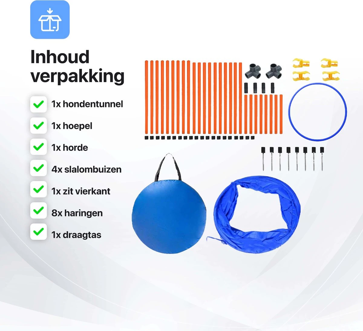 De Tavaro agility set bevat alles wat je nodig hebt om je hond te trainen. Je kan beginnen met de hondentunnel. Een hindernis kan in het begin moeilijk zijn, maar wanneer de hond deze gemakkelijk overwint, kan de training gemakkelijk worden verlengd. Denk aan het slalomparcours, waarbij de hond zo hard mogelijk moet lopen. Of werk aan het springvermogen door het gebruik van hindernissen. Alle onderdelen zijn in hoogte verstelbaar, waardoor deze set geschikt is voor alle honden. Ben jij of je hond uitgeput en uitgetraind? Verberg dan de complete set eenvoudig op in de meegeleverde draagtas.
